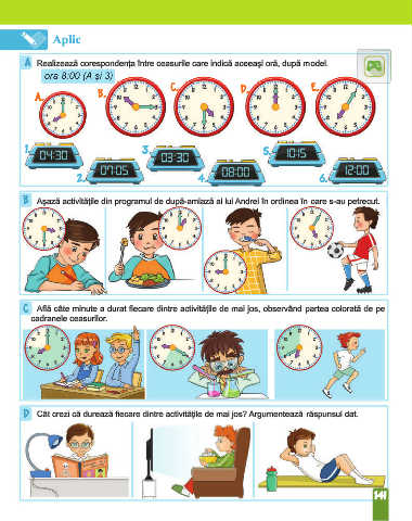 C Află câte minute a durat fiecare dintre activitățile de mai jos, observând partea colorată de pe